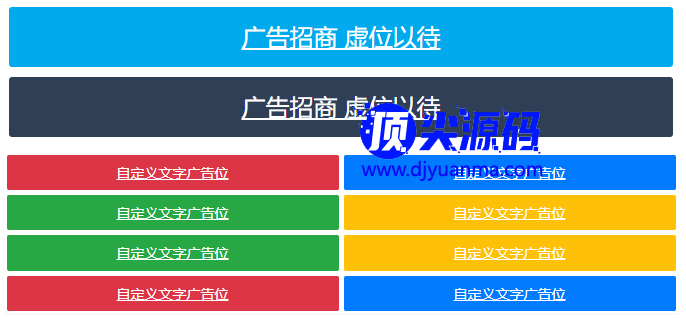 分享一段好看的网站自适应文字加横幅html广告代码,代码上面是图片横幅广告位,(默认一条横幅,可自行增加或删除横幅广告)下边是文字广告位,也是可以增加和删减的,页面相当美观,代码是自适应的,适合市面上大部分网站程序。使用方法:可调用网站任何一个地方,只需把代码放到需要展示的页面即可