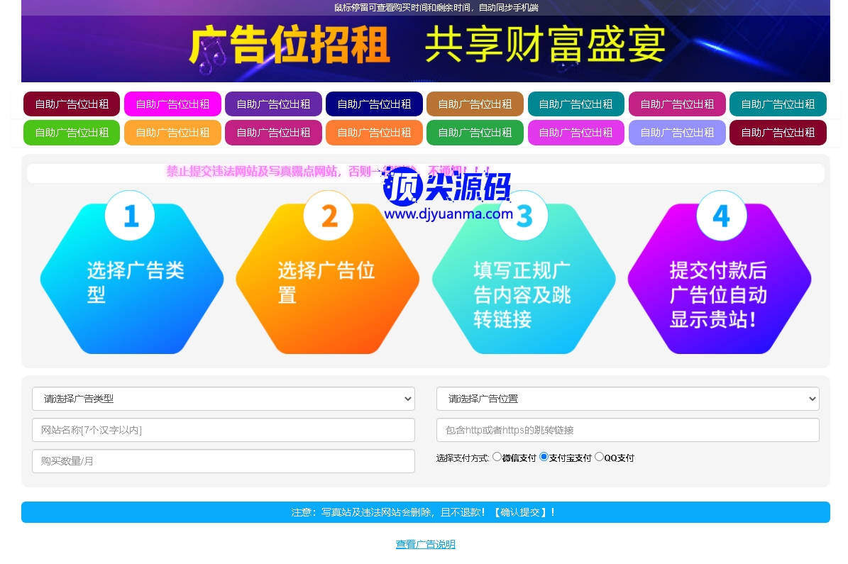 自助购买大横幅,小横幅,文字广告,后台可设置每个广告位的不同价格,颜色,宽高,自由增加修改广告位数量