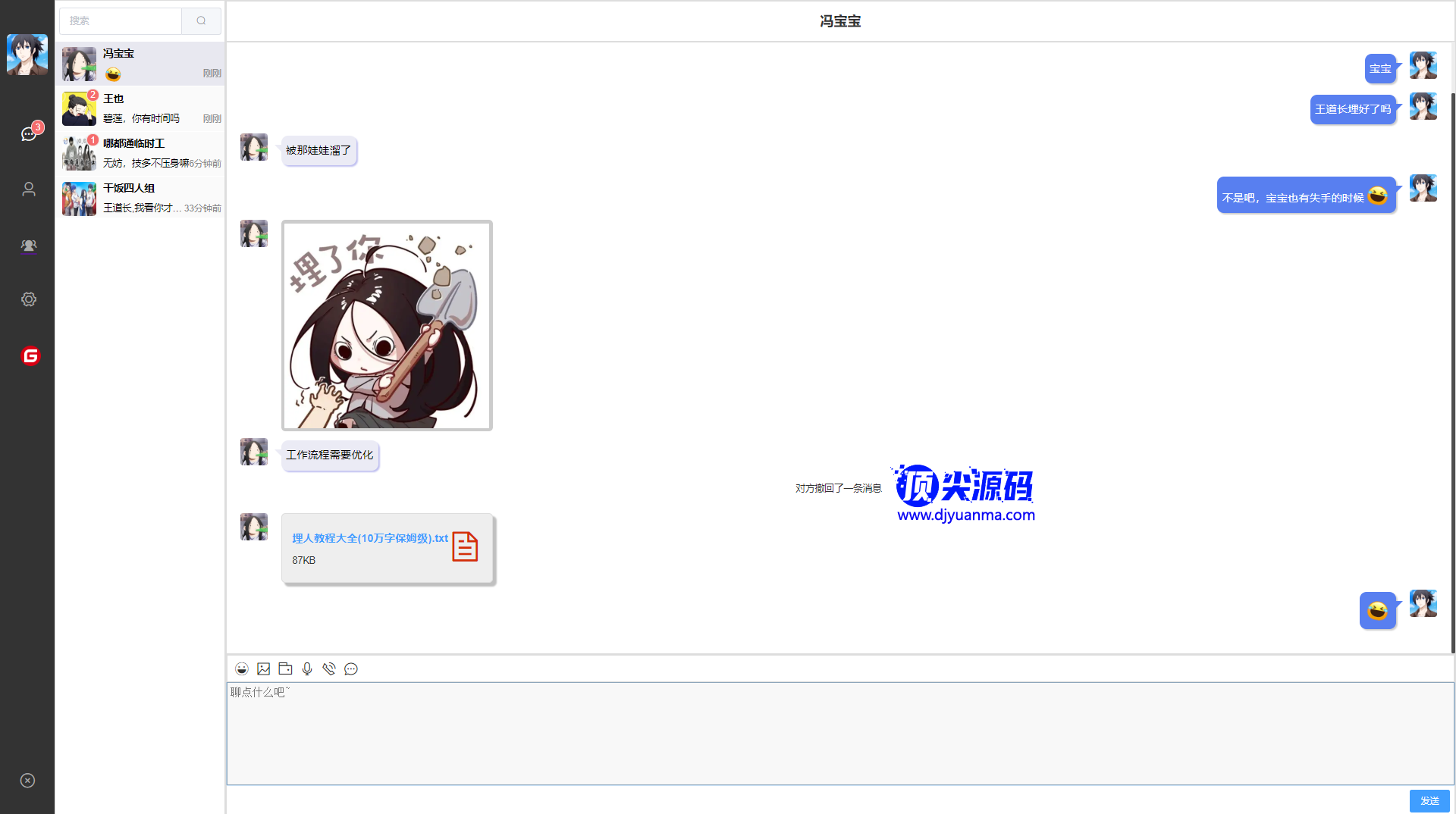 一款开源的实时聊天程序源码,springboot+netty的后端,前端web用的vue写的,跟我们用的微信聊天工具差不多,该有的功能都有,发文件图片表情包这些,还有就是开视频等等的功能均正常使用。测试环境node:v14.16.0,jdk1.8的,maven:3.6.3,数据库用的mysql的5.7版本,运行sql脚本(脚本在im-platfrom的resources/db目录),安装redis和minio。h5的话我们要用到HBuilderX,把im-uniapp导入进去打包即可!