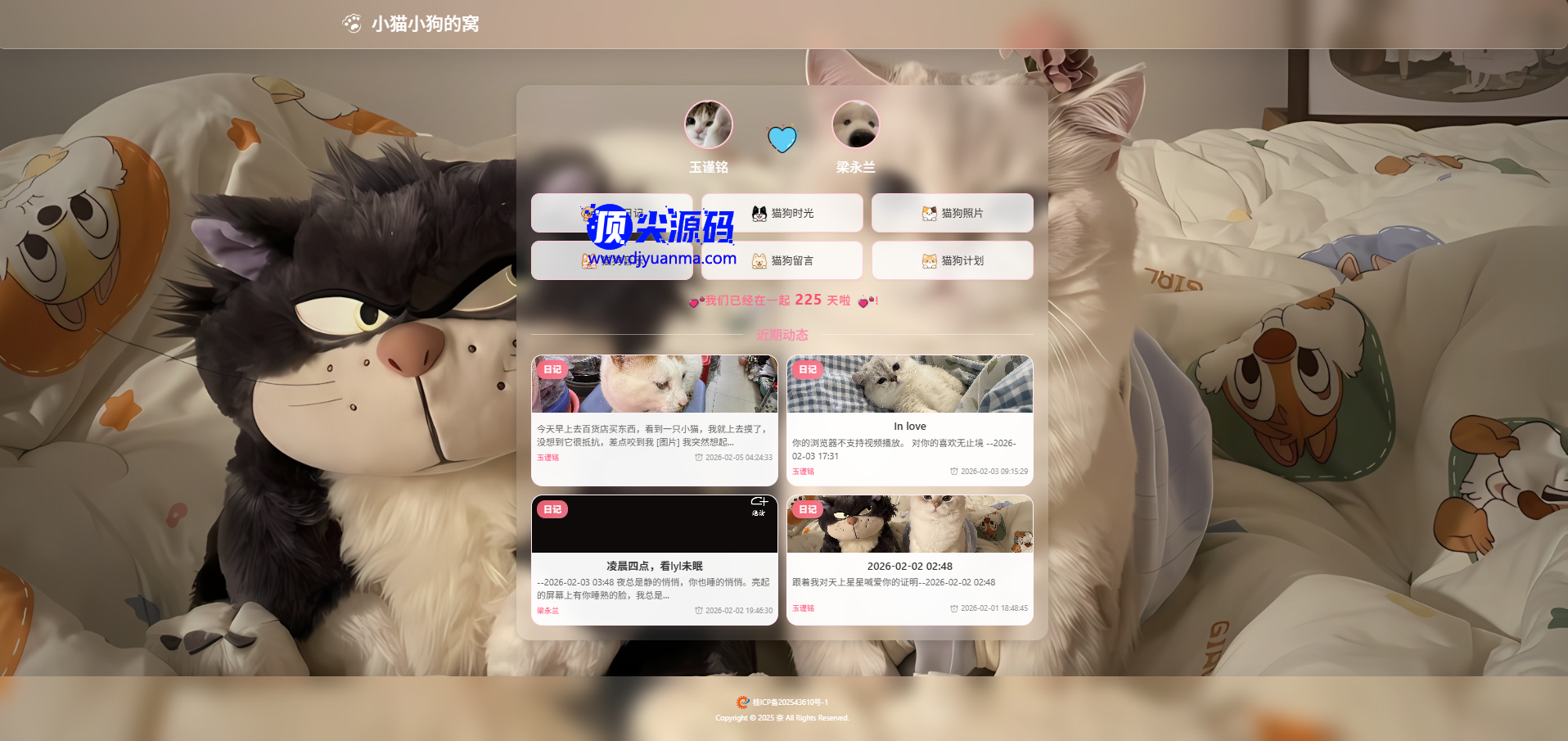 「小猫小狗的窝」是一款面向情侣群体的轻量级博客系统,旨在为恋人们提供一个私密、温馨且功能完备的情感记录空间。项目采用前后端分离架构,支持日记撰写、相册管理、时光胶囊、音乐分享、双向留言及共同计划等核心功能,让每一对情侣都能拥有属于自己的线上小窝。