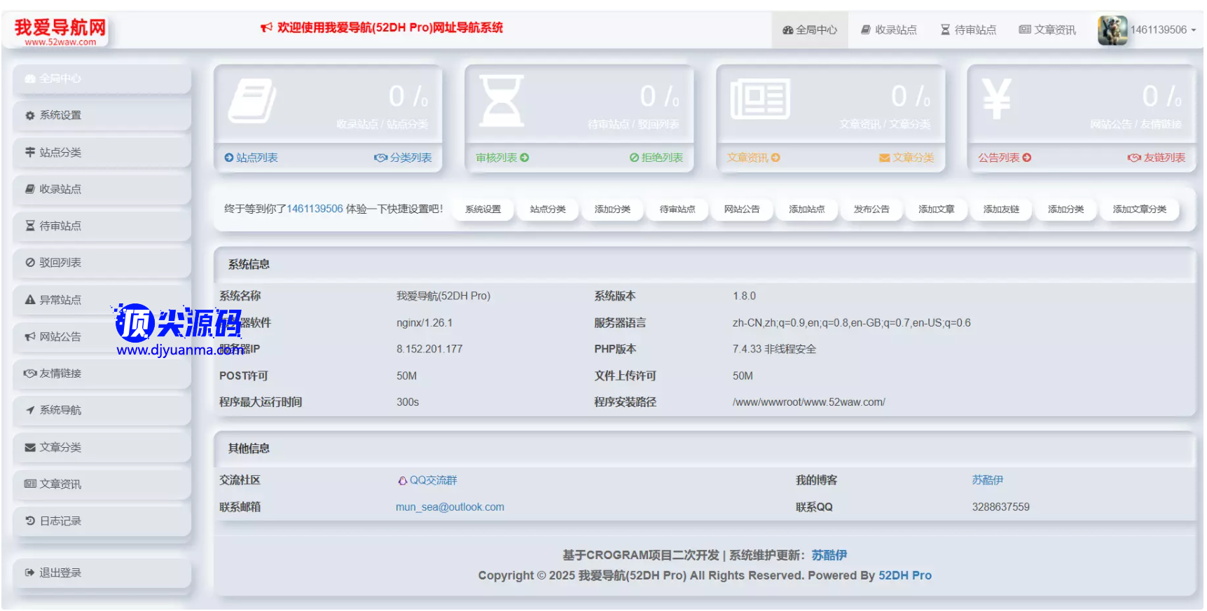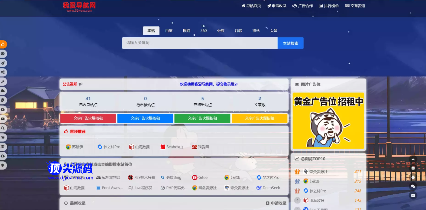 我爱导航(52DH Pro)网址导航系统是由苏酷伊二次开发并免费发布的开源免费的网址导航系统