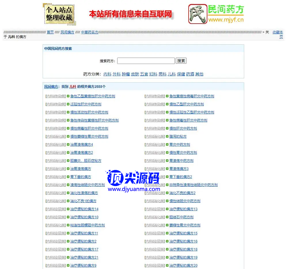 民间药方偏方网整站源码带数据,php版,不需要数据库,数据文件在dat数据格式的文件里,内容包含偏方和药方两部分,有搜索功能!可以结合其他的程序做成比较大的网站!源码安装