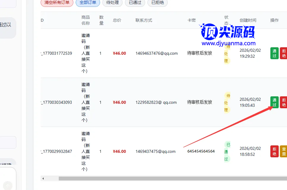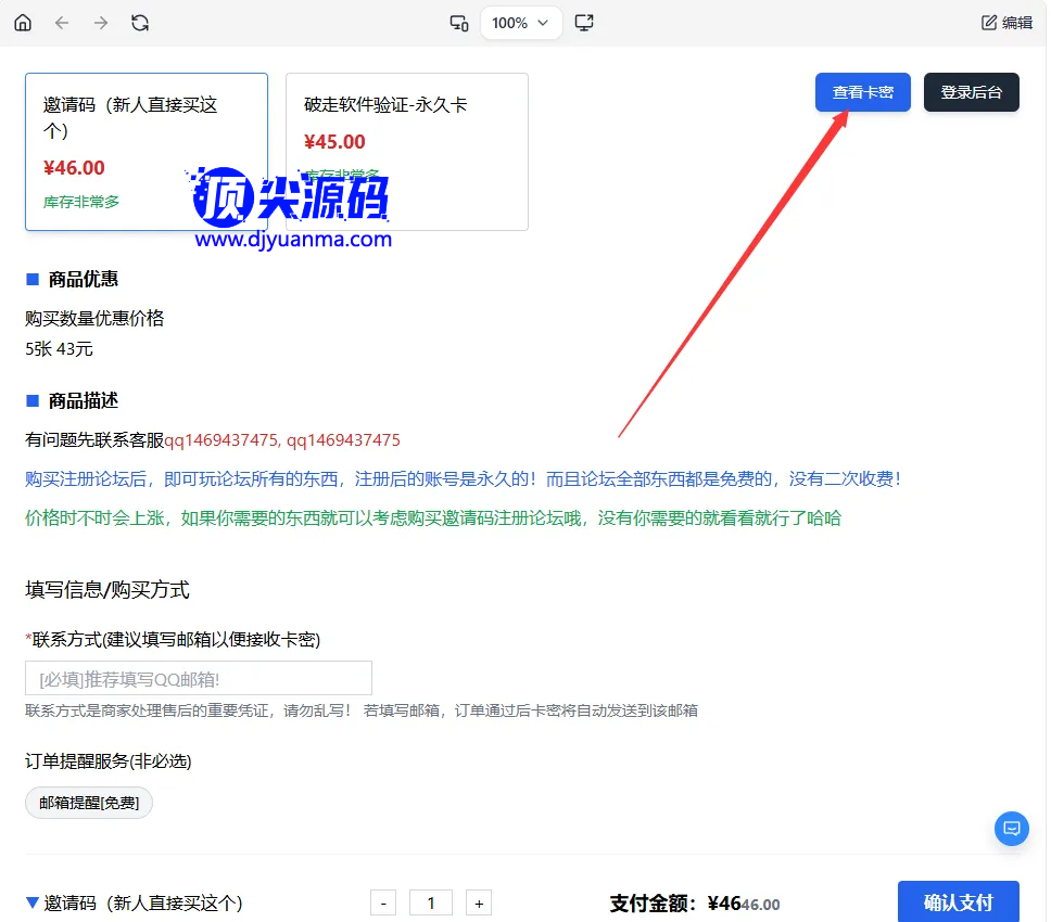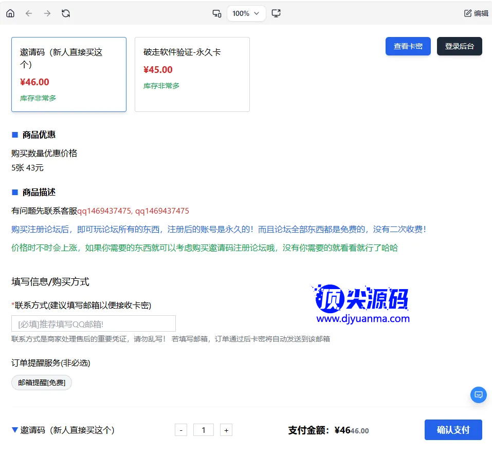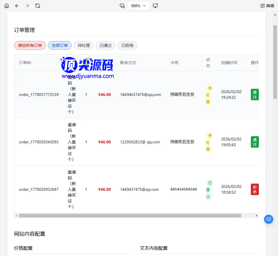 一个基于React+TypeScript+Tailwind CSS的邀请码购买系统,包含前台购买页面和后台管理功能,支持商品管理、订单处理、卡密发放和邮件通知等功能。