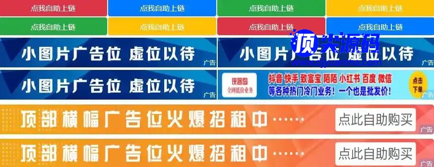自助购买大横幅,小横幅,文字广告,后台可设置每个广告位的不同价格,颜色,宽高,自由增加修改广告位数量