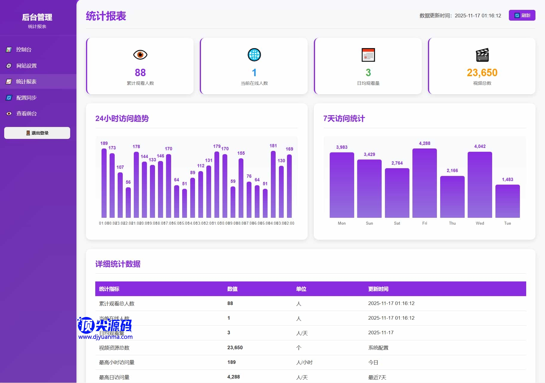 修改网站信息及查看统计报表,适合搭建个人视频站点。